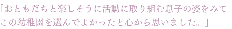 落ち着いて自分の席に座っていられるかさえ不安に感じていましたが、しっかり前を向いて先生の指示を聞き、お友達と一緒に楽しそうに製作や合唱に取り組む息子の姿を見て、この幼稚園を選んでよかったと心から思いました。